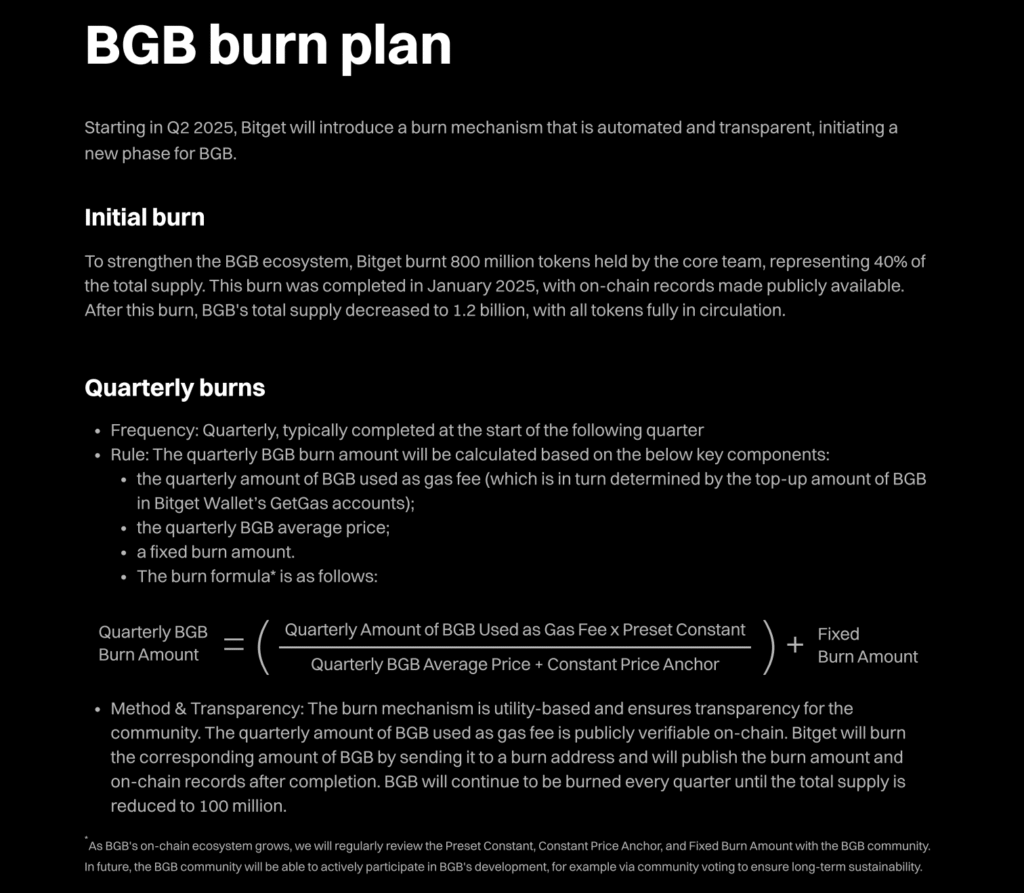 Việc chuyển đổi BGB từ không bắt buộc sang thiết yếu đòi hỏi nhiều hơn là chỉ mở rộng tiện ích. Chúng tôi hiểu rằng một chiến lược cắt giảm nguồn cung mạnh mẽ là yếu tố then chốt trong cơ chế cung ứng của token, do đó giai đoạn đầu tiên đã bắt đầu với các đợt đốt token hàng quý có hệ thống, gắn liền với hiệu suất kinh doanh của Bitget. Không giống như các đợt đốt token mang tính hình thức phổ biến trong ngành, những đợt này thể hiện sự phân bổ vốn đáng kể nhằm cắt giảm nguồn cung. Mỗi quý, 20% lợi nhuận từ hoạt động sàn giao dịch và ví được dùng trực tiếp để mua lại BGB và tiến hành đốt vĩnh viễn.