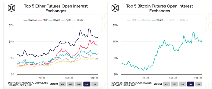 Bitget tiếp tục củng cố vị thế trên thị trường phái sinh trong suốt tháng 8. Theo The Block và Coinglass, Bitget là một trong 3 sàn giao dịch toàn cầu hàng đầu về hợp đồng mở đối với cả futures Bitcoin và Ethereum. Hợp đồng mở futures Bitcoin trên Bitget đã vượt 10 tỷ USD, trong khi futures Ethereum vẫn duy trì ổn định ở phạm vi 5–7 tỷ USD, cho thấy sự tham gia bền vững của các tổ chức và nhà đầu tư nhỏ lẻ. Sự tăng trưởng này làm nổi bật khả năng của Bitget trong việc thu hút các nhà giao dịch khối lượng lớn tìm kiếm thanh khoản, hiệu quả và phí giao dịch cạnh tranh.