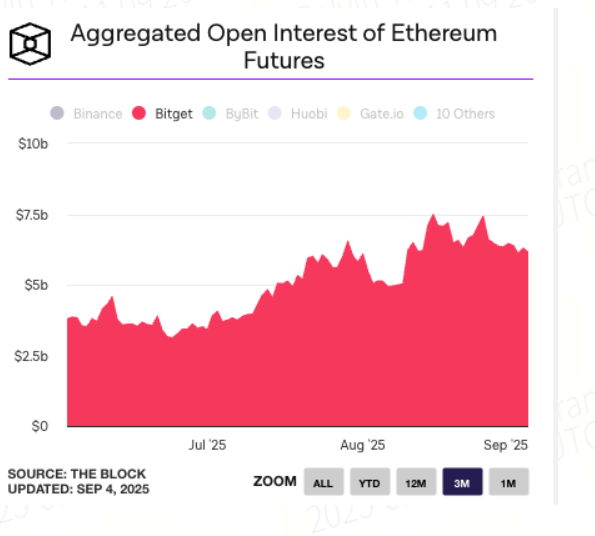 Bitget đóng vai trò chủ chốt trên thị trường futures Ethereum, luôn nằm trong 3 sàn giao dịch hàng đầu trên toàn cầu. Tính đến cuối tháng 8, hợp đồng mở ETH của Bitget đã tăng lên hơn 6 tỷ USD, một mức tăng đáng kể so với đầu năm. Mức tăng trưởng này phản ánh niềm tin của người dùng đối với thanh khoản và hạ tầng của Bitget, củng cố hơn nữa vị thế dẫn đầu của sàn giao dịch trong hoạt động giao dịch phái sinh dựa trên ETH.
