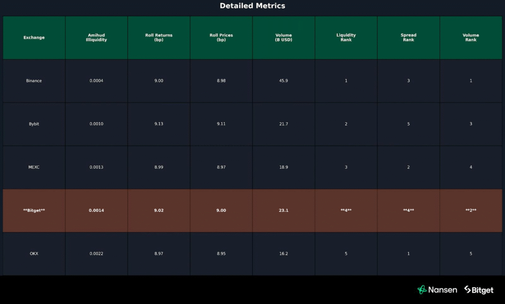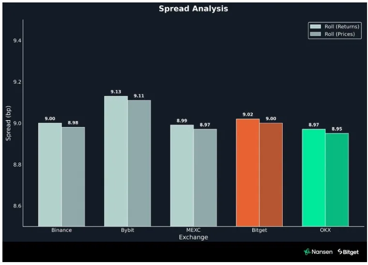 • Chi phí Giao dịch (Roll Spread): Chênh lệch giá mua/giá bán của Bitget (9.02 bp) nằm trong nhóm cạnh tranh nhất, khẳng định chi phí giao dịch thấp và ổn định ngay cả trong giai đoạn biến động cao.