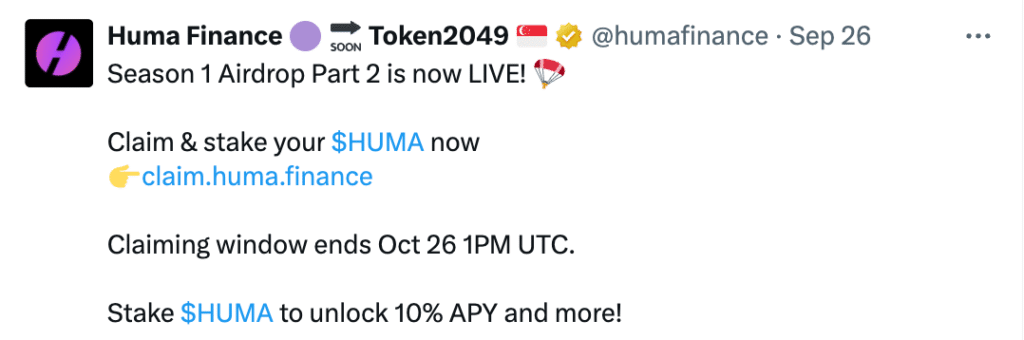 Airdrop HUMA được thiết kế để mang lại sự tham gia công bằng và dài hạn, nghĩa là những người ủng hộ và nắm giữ trong khoảng thời gian nhận sẽ có vị thế tốt nhất để có cơ hội trong tương lai.