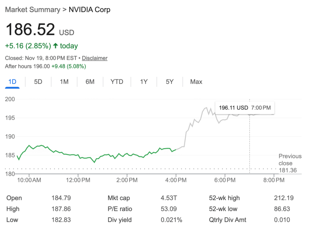 Vào ngày Nvidia công bố báo cáo thu nhập quý 3 năm tài chính 2025, sự phấn khích lan tỏa khắp thị trường. Cổ phiếu của Nvidia tăng vọt hơn 5% trong phiên giao dịch ngoài giờ. Xu hướng này nhanh chóng thúc đẩy các cổ phiếu chip và AI liên quan—AMD tăng gần 4%, Micron (MU) hơn 3% và thậm chí cả những gã khổng lồ công nghệ như Amazon (AMZN), Google (GOOG), Meta (META) và Microsoft (MSFT) cũng ghi nhận mức tăng. Báo cáo thu nhập của Nvidia đã xua tan nỗi lo ngại trước mắt về “bong bóng” định giá AI, củng cố câu chuyện nhu cầu cơ bản của ngành.