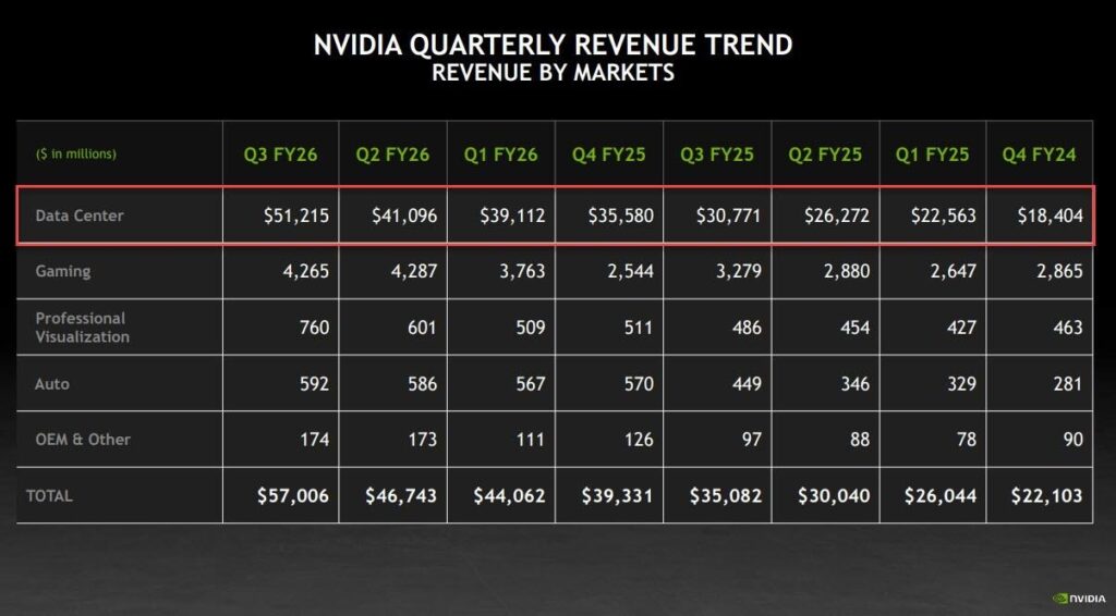 Con số chính từ báo cáo thu nhập của Nvidia thật đáng kinh ngạc: 57,01 tỷ USD doanh thu quý 3, tăng 62% so với cùng kỳ năm ngoái và vượt xa ước tính nội bộ và của Phố Wall. Điểm nổi bật trong báo cáo thu nhập của Nvidia là gần 90% doanh thu này đến từ phân khúc trung tâm dữ liệu tập trung vào AI—xác nhận rằng Nvidia là động lực chính cho cơ sở hạ tầng AI toàn cầu.