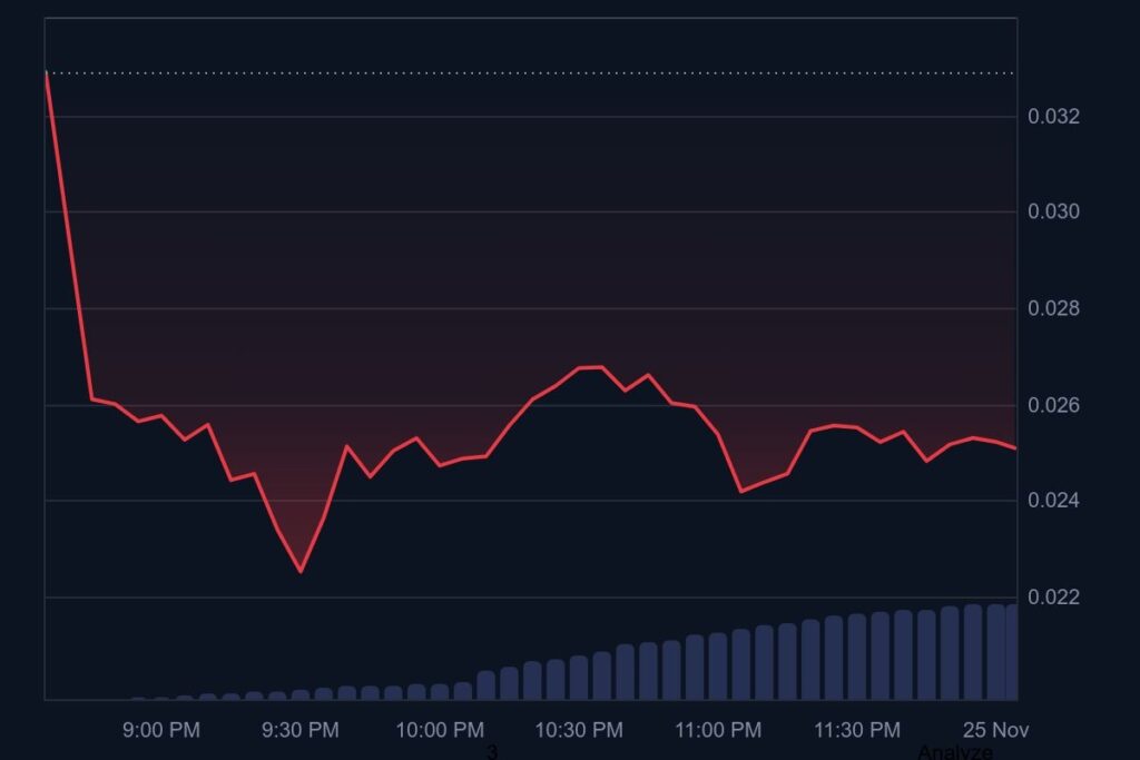 ● Kịch bản giảm giá ($0,025–$0,03): Nếu động lực suy giảm hoặc các holder lớn chốt lời, MON có thể lơ lửng ở mức ngay trên giá ra mắt. Thanh khoản thấp, tích hợp bị trì hoãn, hoặc thị trường chung có xu hướng rủi ro có thể giữ giá quanh $0,025 đến hết năm.