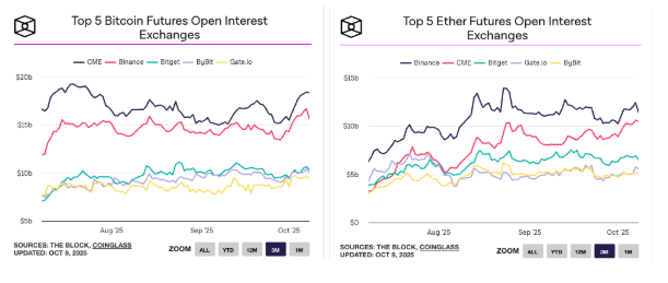 Trong Q3/2025, Bitget vẫn nằm trong top 3 toàn cầu về open interest cho hợp đồng BTC và ETH — BTC ổn định khoảng 9–11 tỷ USD, ETH tăng từ ~5 tỷ lên ~8 tỷ USD.