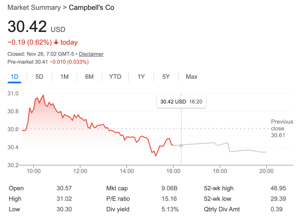 Cổ phiếu Campbell Soup hiện đang giao dịch quanh mức $30, giảm mạnh so với mức cao nhất trong 52 tuần. Trong những tháng gần đây, các nhà phân tích đã phản ứng trước bê bối liên tục và khó khăn trong hoạt động bằng hàng loạt báo cáo thận trọng. Barclays đã hạ mục tiêu giá cổ phiếu Campbell Soup xuống còn $35. UBS cũng giảm mục tiêu xuống $30, duy trì triển vọng tiêu cực do “những nền tảng khó khăn” mà Campbell Soup đang đối mặt. CFRA, dù lạc quan hơn đôi chút, vẫn chỉ đưa ra mục tiêu giá $37 nhưng không nâng hạng cổ phiếu Campbell Soup.