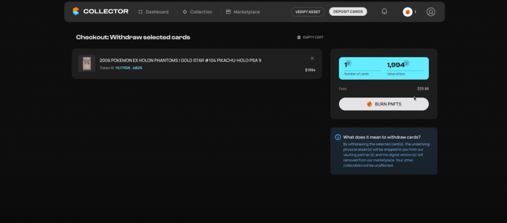 Collector Crypt đảm bảo quá trình chuyển đổi từ sở hữu số về vật lý đơn giản và an toàn. Khi người dùng muốn nhận thẻ Pokémon thật được đại diện bởi Tokenized Pokémon Card, họ thực hiện yêu cầu đổi trong tài khoản Collector Crypt của mình. Theo hướng dẫn nền tảng, người dùng đốt NFT, đảm bảo thẻ cụ thể rời khỏi danh sách token hóa.