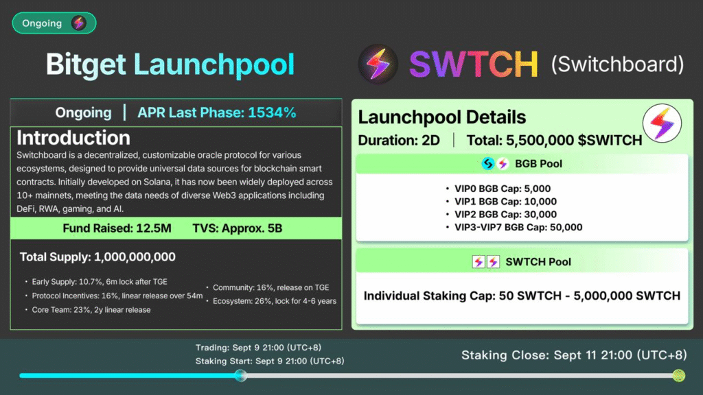 Bước tiến mới trên Launchpool của Bitget Ngày 9/9/2025, Bitget chính thức niêm yết Switchboard (SWTCH) trên nền tảng Launchpool,
