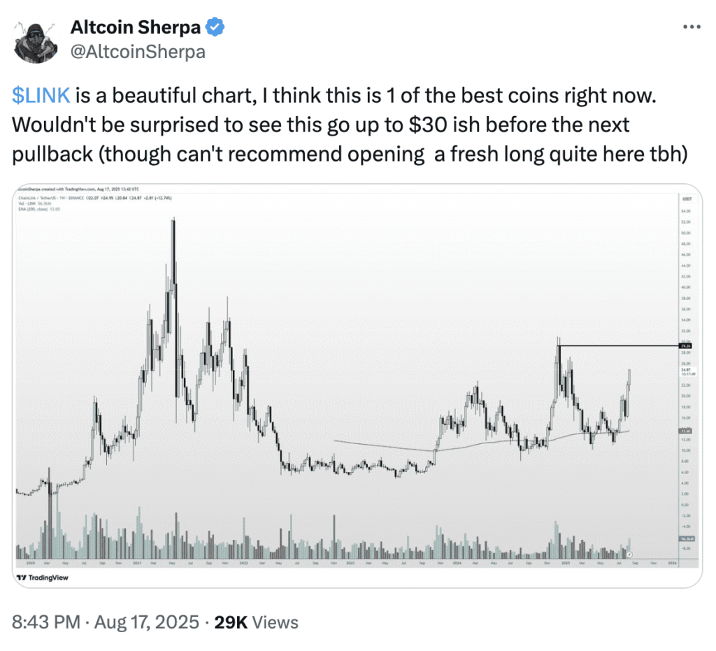 Những ý kiến nổi bật như Altcoin Sherpa đã gọi LINK là “một trong những đồng coin tốt nhất hiện nay,” tuy nhiên họ cũng cảnh báo rằng mức $30 có thể trở thành kháng cự mạnh, nơi một số nhà đầu tư có thể chốt lời. Tuy vậy, sự hứng khởi còn được củng cố bằng dữ liệu thực tế: Khối lượng giao dịch trong ngày của LINK đã tăng vọt hơn 60% trong 24 giờ qua, xác nhận nguồn tiền mới đang đổ vào thay vì chỉ là sự phấn khích ảo.