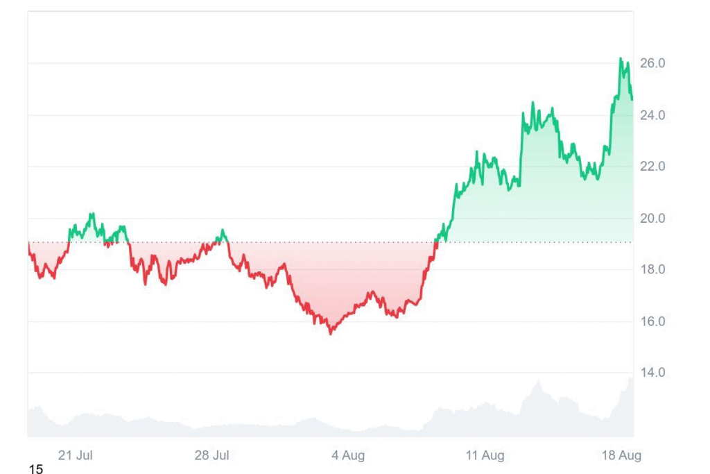 Chainlink (LINK) đã trở thành tiêu điểm trong tuần này khi tăng vọt lên hơn $26, mức cao nhất trong khoảng 18 tháng qua. Động lực này đã đưa LINK trở thành một trong những đồng tiền điện tử vốn hóa lớn hoạt động tốt nhất, vượt mặt phần lớn thị trường với mức tăng hai chữ số trong ngày. Đối với các nhà đầu tư, câu hỏi lớn hiện nay là liệu đợt tăng giá này có đủ lực để đẩy token lên mức tâm lý quan trọng $30 hay không — một mức giá chưa từng xuất hiện kể từ đầu năm 2022.
