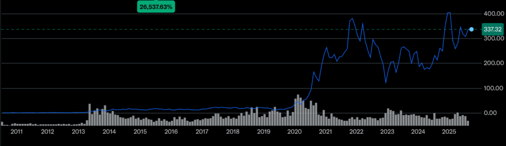 Cổ phiếu Tesla đi theo hướng ngược lại trong năm 2025. Sau khi đạt đỉnh kỷ lục vào cuối 2024, cổ phiếu giảm mạnh do giao hàng chậm lại và cạnh tranh gia tăng. Dù đôi lúc tăng trở lại cho thấy nhà đầu tư vẫn hứng khởi, nhưng xu hướng chung là giảm, phản ánh những trở ngại vận hành và định giá quá cao.