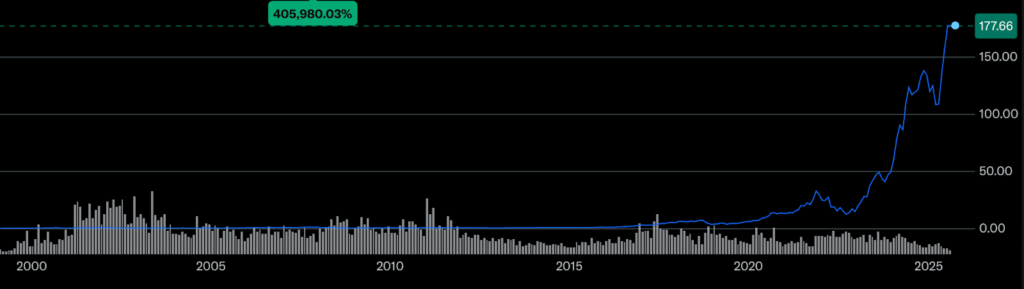 Cổ phiếu Nvidia là một trong những mã có hiệu suất mạnh mẽ nhất năm 2025. Sau cú sụt đầu năm do lo ngại thiếu nguồn cung chip và cạnh tranh tăng, cổ phiếu nhanh chóng phục hồi nhờ nhu cầu phần cứng AI bùng nổ. Đến giữa mùa hè, công ty không chỉ lấy lại toàn bộ khoản lỗ mà còn đạt mức giá lịch sử, củng cố vai trò dẫn đầu AI trên thị trường.