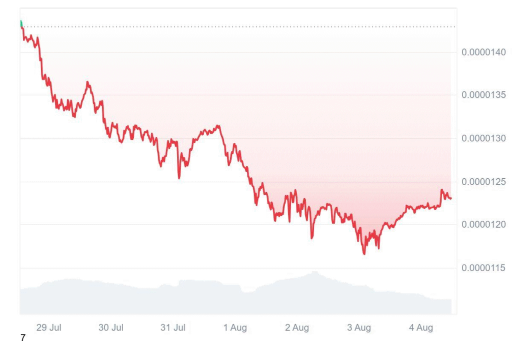 Trong vài tuần qua, Shiba Inu đã giảm từ mức cao giữa tháng 7 gần $0.000016 xuống còn khoảng $0.000012 vào đầu tháng 8, đánh dấu mức thấp nhất kể từ ngày 9 tháng 7. Tại thời điểm viết bài, SHIB đang giao dịch quanh mốc $0.00001218, sau một đợt bật tăng trong ngày khoảng 1%. Đợt giảm này diễn ra song song với sự sụt giảm chung của thị trường — Bitcoin và Ethereum lần lượt giảm khoảng 3% và 8% trong cùng kỳ — khi các áp lực kinh tế vĩ mô, bao gồm thông báo thuế quan mới của Mỹ làm đồng đô la mạnh lên và ảnh hưởng đến các tài sản rủi ro.