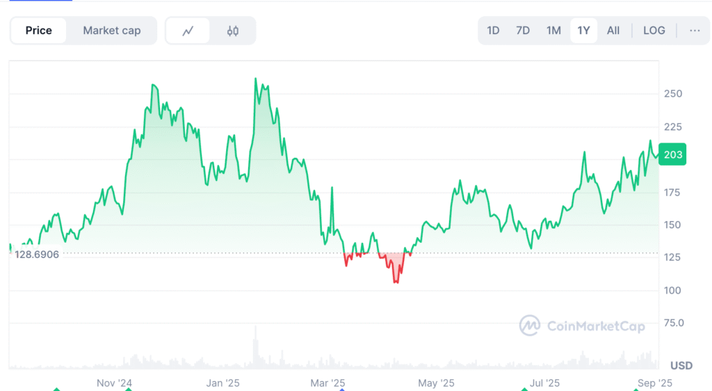 Hành trình giá của Solana đã được đánh dấu bởi những đợt tăng giá nhanh chóng và các giai đoạn điều chỉnh. Sau khi đạt mức cao nhất mọi thời đại khoảng $294 vào đầu năm 2025, SOL đã trải qua một đợt giảm giá đáng kể nhưng đã ổn định kể từ đó. Tính đến tháng 09/2025, Solana đang giao dịch gần $200, điều chỉnh trong một phạm vi tích lũy rộng.