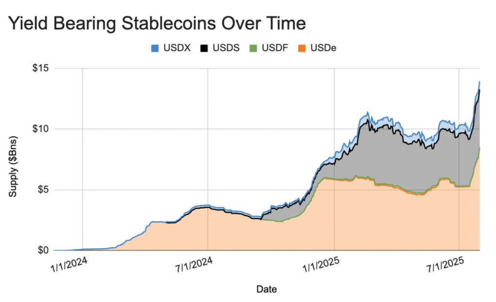 Kể từ giữa năm 2025, sự bứt phá của Ethena USDe thật sự bùng nổ. Vào tháng Bảy, Hoa Kỳ đã ban hành GENIUS Act, lần đầu tiên cấm các tổ chức phát hành stablecoin trả lãi cho khách hàng lẻ. Trớ trêu thay, quy định này đã kích hoạt làn sóng dòng tiền chuyển sang các lựa chọn sinh lợi như USDe, đẩy nguồn cung lưu hành của nó tăng gần 70% chỉ trong vài tuần và vốn hóa thị trường lên tới 9,5 tỷ đô, vững chắc ở vị trí số 3 sau USDT và USDC. Đồng thời, governance token của USDe—ENA—cũng đã tăng hơn 60%, là tín hiệu rõ ràng nhà giao dịch nhận thấy đây là thời điểm bước ngoặt lớn cho stablecoin sinh lợi.