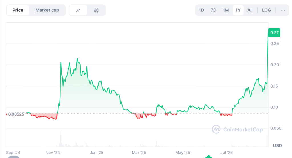 Đến cuối tháng 8 năm 2025, bối cảnh lại thay đổi khi Trump Media & Technology Group tiết lộ kế hoạch dùng Cronos làm tài sản dự trữ kho bạc. Sau khi xác nhận chiến lược quan trọng này, khối lượng giao dịch CRO tăng vọt, giá token tăng gần 30% chỉ trong vài giờ – từ khoảng $0.17 lên sát mức $0.22 trước khi xuất hiện một số động thái chốt lời.