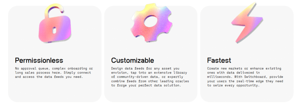Switchboard cung cấp nguồn cấp dữ liệu có thể tùy chỉnh trên nhiều blockchain, giúp người dùng có thể truy cập mọi loại dữ liệu bất kỳ lúc nào với độ chính xác được xác minh và tốc độ cao. Nền tảng này phục vụ hơn 100 dự án blockchain và xử lý hàng trăm triệu yêu cầu hàng tuần cho hơn 500 loại tài sản khác nhau.
