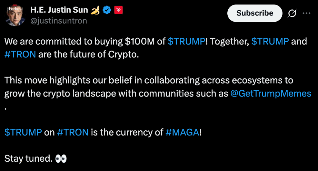 Một trong những biến số lớn nhất quanh đợt mở khóa token TRUMP là tin đồn về sự tham gia của Justin Sun, nhà sáng lập blockchain Tron và là một trong những gương mặt nổi bật nhất trong làng crypto. Dù chưa có tuyên bố hợp tác chính thức giữa Sun và dự án TRUMP, các phát ngôn công khai và hoạt động on-chain của Sun cho thấy ông đặc biệt quan tâm đến token này. Đầu tháng này, Sun đã cam kết đầu tư 100 triệu đô la vào TRUMP, hứa hẹn nâng tầm nhận diện của token tại châu Á và xa hơn nữa. Tuyên bố táo bạo này ngay lập tức làm dấy lên sóng đồn đoán, khi nhiều thành viên cộng đồng đặt câu hỏi liệu Sun hoặc các thực thể liên quan có trở thành nhà mua lớn trong sự kiện mở khóa sắp tới hay không.